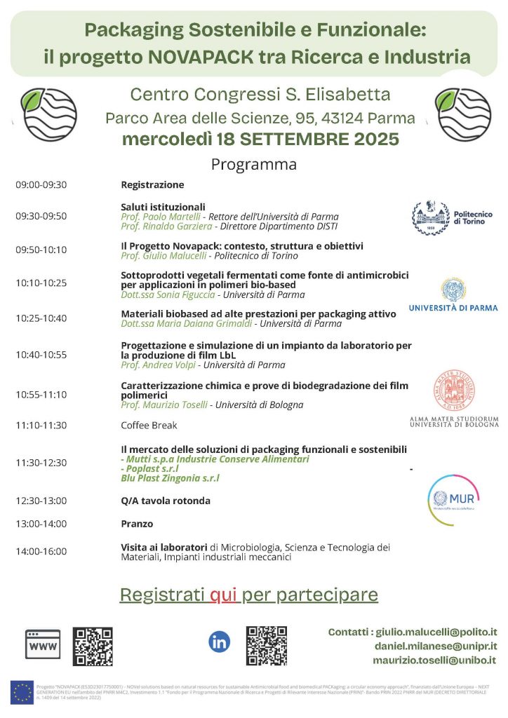 On September 18, 2025, the workshop “Packaging Sostenibile e Funzionale: il Progetto NOVAPACK tra Ricerca e Industria” took place at the Centro Congressi S. Elisabetta of the University of Parma. The event provided an opportunity to share the results obtained so far in the NOVAPACK project and to discuss current needs and trends in food packaging with representatives from Mutti Spa, Poplast Srl, and Blu Plast Zingonia Srl. Many thanks to all the participants for the fruitful discussions!